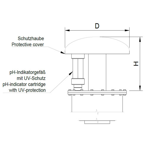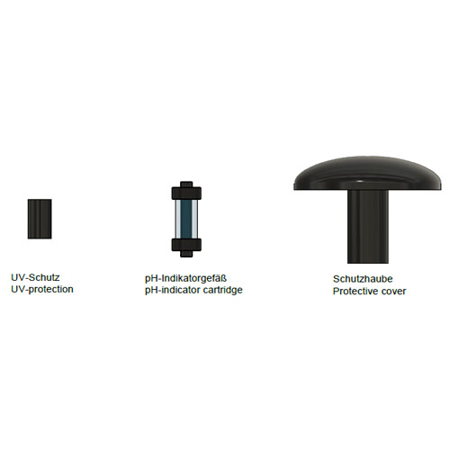 Der pH- Indikator wird für die Aussenaufstellung im Set mit zusätzlichen Anbauteilen ausgerüstet: - Anbauteil: UV- Schutzrohr aus PE-el, geschlitzt für das Sichtrohr - Anbauteil: Schutzhaube aus PE-el für ATEX-pH-Indikatorgefäss Die pH-Indikatoren für laugehaltige Abluft sind geeignet und ausgelegt für ATEX-Chemikaliendunstabscheider der Typenreihe SDA90-el, SDA90-1L-el, SDA125-el, SDA160-el, SDA250-el und SDA315-el. - Sofort aufschraubbar und betriebsbereit - Einbau vertikal - Deckel, pH- Indikatorgefäss und Schutzhaube abschraubbar - pH-Indikator-Anschluss G1 Aussengewinde - Sichtrohr aus Borosilikatglas d65 mm Höhe: 50 mm - Aussenaufstellung Ist die Filterkapazität des Säuredunstabscheiders verbraucht, reagiert das innenliegende Indikatorvlies im transparenten pH-Indikatorgefäss aus Borosilikatglas mit einem Farbumschlag. Bei Einsatz mit laugehaltiger Abluft erfolgt der Farbumschlag von blau nach weiß, bei Erreichen des pH-Wertes von 9,4. Die Sättigung der PURO-Granulate wird unmittelbar durch den Farbumschlag im pH-Indikatorvlies optisch angezeigt. Nach einer Reaktion durch Farbumschlag muss das Indikatorvlies im pH-Indikatorgefäss entsorgt und durch ein neues Vlies ersetzt werden. |