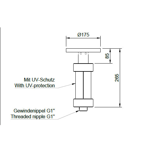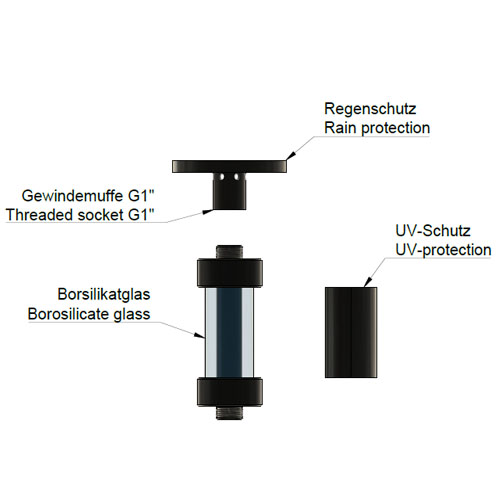 Der pH- Indikator wird für die Aussenaufstellung im Set mit zusätzlichen Anbauteilen ausgerüstet: - Anbauteil: UV- Schutzrohr aus PE-el, geschlitzt für das Sichtrohr - Anbauteil: Schutzhaube aus PE-el für ATEX-pH-Indikatorgefäss Die pH-Indikatoren für säurehaltige Abluft sind geeignet und ausgelegt für ATEX-Chemikaliendunstabscheider der Typenreihe SDA90-el, SDA90-1L-el, SDA125-el, SDA160-el, SDA250-el und SDA315-el. - Sofort aufschraubbar und betriebsbereit - Einbau vertikal - Deckel, pH- Indikatorgefäss und Schutzhaube abschraubbar - pH-Indikator-Anschluss G1 Aussengewinde - Sichtrohr aus Borosilikatglas d65 mm Höhe: 50 mm - Aussenaufstellung Ist die Filterkapazität des Säuredunstabscheiders verbraucht, reagiert das innenliegende Indikatorvlies im transparenten pH-Indikatorgefäss aus Borosilikatglas mit einem Farbumschlag. Bei Einsatz mit säurehaltiger Abluft erfolgt der Farbumschlag von blau nach gelb, bei Erreichen des pH-Wertes von 4,6. Die Sättigung der PURO-Granulate wird unmittelbar durch den Farbumschlag im pH-Indikatorvlies optisch angezeigt. Nach einer Reaktion durch Farbumschlag muss das Indikatorvlies im pH-Indikatorgefäss entsorgt und durch ein neues Vlies ersetzt werden. Die Abscheider der Größe SDA90 - SDA125 dürfen aussen nur bei frostfreier Aufstellung eingesetzt werden, weil die ATEX-Heizmanschetten erst ab SDA160 lieferbar sind. |