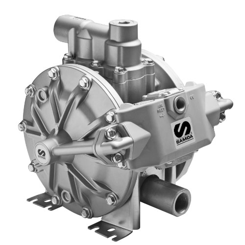Luftbetriebene Doppelmembranpumpen zum Dosieren, Sprühen, Umpumpen, Abpumpen und Verteilen einer Vielzahl von Flüssigkeiten. Ausgelegt auf maximale Leistung und Effizienz bei Anwendungen mit hohem Durchfluss. Kunststoffpumpen werden für einige Eintauchanwendungen und aggressive Atmosphären empfohlen. Für den Einsatz in explosionsgefährdeten Bereichen sind vollständig erdungsfähige Pumpen mit ATEX-Zertifizierung erhältlich (Ex II2 GD IIB/IIC 95 ?C) Übersetzungsverhältnis: 1:1 Max. freie Fördermenge*: 200 l/Min. (53 gal/Min.) Fördermenge pro Hub (ca.)*: 0,5 Liter (0,13 US gal) Fördermenge je Zyklus (2 Hübe)*: 1 Liter (0,26 US gal) Luftdruck-Betriebsbereich: 1,5 bis 8 bar (22 bis 115 psi) Max. Größe der Feststoffe in Suspension: 6 mm (1/4 Zoll) Max. Trockenansaughöhe*: 5 m (16 Fuß) Max. Nassansaughöhe*: 8 m (26 Fuß) Gewicht: 10,5 kg (23,15 lb) Anschluss Saugseite: 1 Zoll DIN PN-10 DN25 Flansch und ANSI B16,5 1 Zoll 150 lb Flansch Anschluss Druckseite: 1 Zoll DIN PN-10 DN25 Flansch und ANSI B16,5 1 Zoll 150 lb Flansch Luftanschluss: 3/8 Zoll NPSM (F) Materialien der medienberührenden Teile Siehe Tabelle |