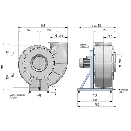 HF - Radialventilator in elektrisch ableitfähiger Ausführung mit Direktantrieberfüllt die Ökodesign-Richtlinie ErP Korrosionsbeständiger Kunststoff-Radialventilator mit Gehäuse aus PE-el, elektrisch ableitfähig, in gesinterter Ausführung, einseitig saugend, Einlaufdüse mit Dichtung als Inspektionsöffnung, leicht demontierbar, Kondensatstutzen an tiefster Stelle des Gehäuses, Splitterschutz gemäß UVV als kunststoffbeschichtetes Drahtgeflecht. Laufrad PPs-el mit rückwärts gekrümmten Schaufeln, elektrisch ableitfähig, statisch und dynamisch ausgewuchtet, Auswuchtgüte mindestens G 6.3 (DIN ISO 21940-11), mit Taperlock- Buchse auf der Motorwelle befestigt. Ventilatorgestell in kräftiger Stahlschweißkonstruktion in verzinkter Ausführung, mit Motortragplatte. Ventilatorgestell geeignet zur Aufnahme des Ventilatorgehäuses mit Laufrad sowie des Motors. Minimalspaltdichtung am Wellendurchgang.Gummischwingungsdämpfer und elastische Manschetten mit VA-Spannbändern für Saug- und Druckseite sind im Lieferumfang enthalten. Volumenstrom : 1300- 5500 m³/h Statische Druckdifferenz : 577- 154 Pa Gehäusestellung : GR 360 (in 45° Schritten wählbar) Motorleistung : 1,1 kW Drehzahl - Motor : 950 1/min Spannung : 3~ 230/400 V Frequenz : 50 Hz Nennstrom : 2,7 A Schutzart/Motorschutz : IP 55/Kaltleiter Ex-Klassifizierung : II 2G Ex db eb IIC T4 Gb Motor für FU geeignet : Ja ATEX Ventilator Ex-Bezeichnung: Ex II 2G Ex h IIB+H2 T4 Gb Anforderung INNEN : Kategorie 2 (Zone 1) Temperaturklasse : T4 (135 °C) Anforderung AUSSEN : Kategorie 2 (Zone 1) Temperaturklasse : T4 (135 °C) |