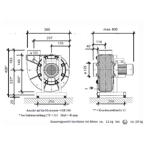 Direktgetriebener Radialventilator zur Förderung aggressiver Gase, Temperatur max 40°C Gehäuse aus PPs, in gespritzter Ausführung mit integrierten Dichtungssystem, bestehend aus Kondensatwehr als umlaufende Tropfkante und einer Labyrinthdichtung, Kondensatablaufstutzen an der tiefsten Gehäusestellung Laufrad mit rückwärtsgekrümmten Schaufeln aus PPs, in gespritzter Ausführung mit Rückenbeschaufelung für garantierten Unterdruck an der Wellendurchführung im Betrieb Gehäusestellung GL, Ausblasrichtung 45° / 90° / 135° / 180° / 270° / 315° /360° Grundrahmen: Stahl-verzinkt Antrieb : Normmotor 3 x 230/400V, 50 Hz, IP55, Wärmeklasse F, mit Thermokontakt Zubehör : Gummi -Schwingungsdämpfer Volumenstrom m3/h 80 - 790 Druckdifferenz PA 560 - 240 Schutzart PTC (Kaltleiter) Polzahl 2 ync. Drehzahl bei 50 Hz 3000 1/min Motorleistung kW 0,12 Nennstrom bei 400 V 0,5 A Baugröße 56 Bauart B5 / IP55 |
