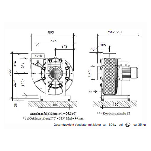 Direktgetriebener Radialventilator zur Förderung aggressiver Gase, Temperatur max 40°C Gehäuse aus PPs, in gespritzter Ausführung mit integrierten Dichtungssystem, bestehend aus Kondensatwehr als umlaufende Tropfkante und einer Labyrinthdichtung, Kondensatablaufstutzen an der tiefsten Gehäusestellung Laufrad mit rückwärtsgekrümmten Schaufeln aus PPs, in gespritzter Ausführung mit Rückenbeschaufelung für garantierten Unterdruck an der Wellendurchführung im Betrieb, Gehäusestellung GR, Ausblasrichtung 45° / 90° / 135° / 180° / 270° / 315° /360° Grundrahmen: Stahl-verzinkt Antrieb : Normmotor 3 x 230/400V, 50 Hz, IP55, Wärmeklasse F, mit Thermokontakt Zubehör : Gummi -Schwingungsdämpfer Volumenstrom m3/h 250 - 1700 Druckdifferenz PA 220 - 60 Schutzart PTC (Kaltleiter) Polzahl 6 Sync. Drehzahl bei 50 Hz 1000 1/min Motorleistung kW 0,18 Nennstrom bei 400 V 1,0 A Baugröße 71 Bauart B5 / IP55 |