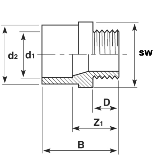 -geeignet nur für Kunststoffgegengewinde -Anschluss: Klebemuffe bzw. -stutzen/Außengewinde konisch -SW=Schlüsselweite |