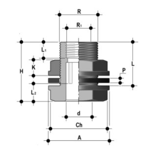 - Anschluss: mit Klebemuffe (d), Gewindestutzen (R) und Gewindemuffe (R1) mit Kontermutter - Dichtung: EPDM |