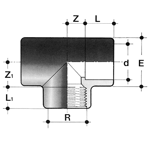- Durchgangsrichtung mit Klebemuffen - Abgang mit Gewindeanschluß nur für Kunststoffgewinde |